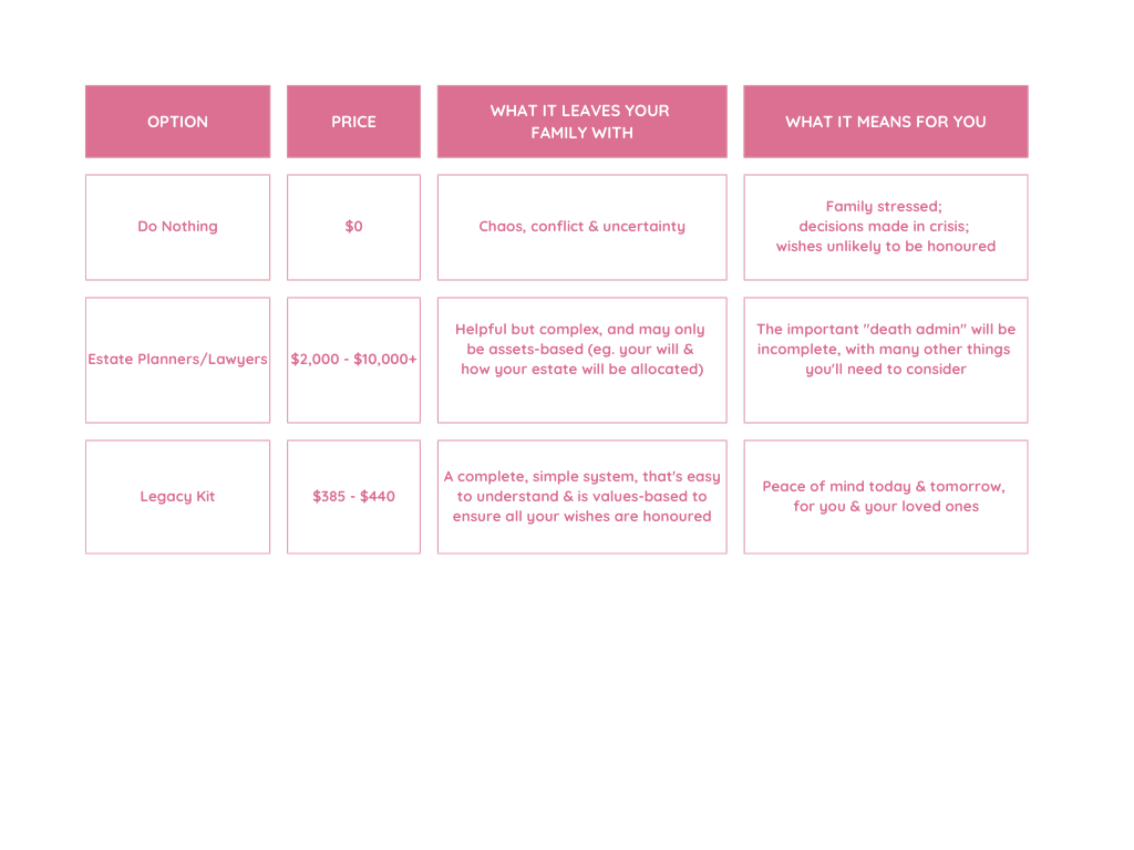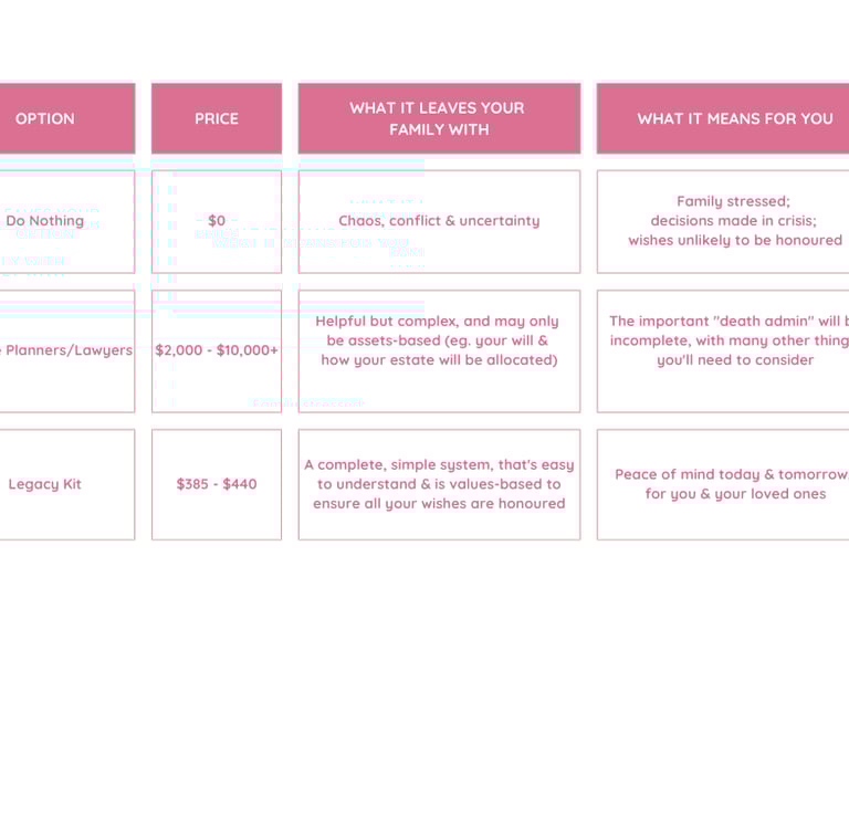 The Legacy Kit was created to prevent that. It’s a simple, guided way to put your affairs, wishes, and important information in one safe place. Planning ahead is an act of love, wisdom, and responsibility, that ensures your loved ones feel supported, not overwhelmed. Owning the Legacy Kit is about being the kind of person who takes care of your family.